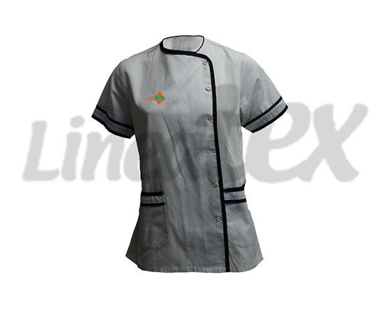 Descripción: Casaca cuello redondo , mangas cortas, solapa cruzada con botones , bolsillos parchados y bies, bordado a la altura del pecho.